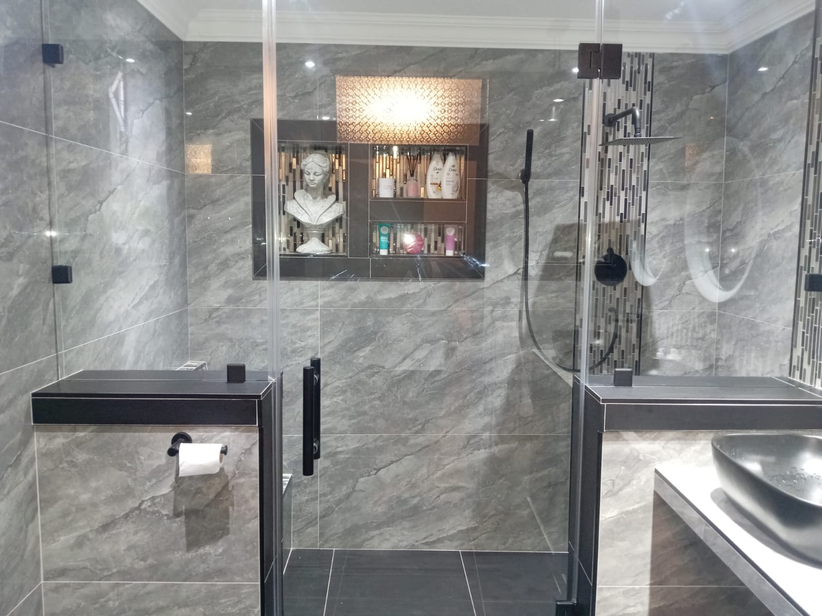 Transforming this bathroom into a sheek, modern oasis with stunning matte black finishes.